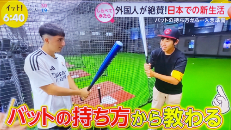野球のバットを握るのも初めてという留学生。TV局スタッフ(野球経験者)の方にバットの持ち方から教わり、いざ打席へ――!